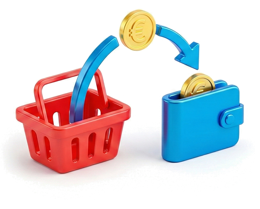 A regular discount reduces your receipt total and your revenue. We increase the customer's purchasing power instead. You receive the full amount the customer is willing to spend (Top Up), while allowing them to choose goods worth more. This is psychologically more attractive for the buyer and more beneficial for your turnover.